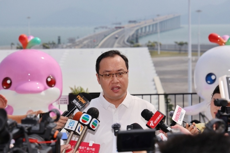 在蓝海豚人工岛上,珠海市文化广电旅游体育局局长闵云童接受媒体采访。南都N视频记者 梁炜培 摄