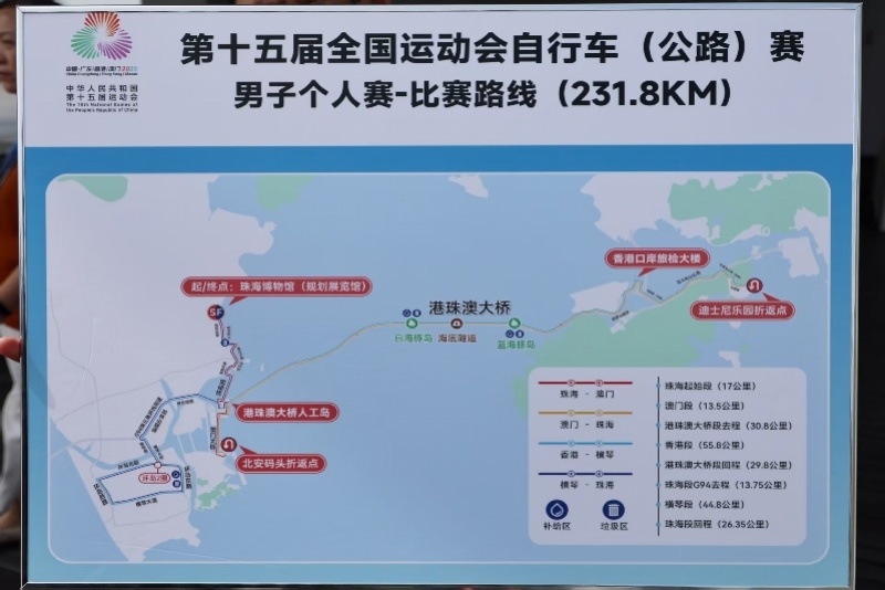 “十五运会自行车(公路)赛男子个人赛是十五运会唯一联结粤港澳三地的标志性跨境赛事。”10月中旬的新闻发布会上,十五运会和残特奥会珠海赛区执委会副主任、珠海市人民政府副市长黄振球介绍,这一最具创新性的赛事,开创了全运会跨境办赛的全新模式,比赛路线以港珠澳大桥为纽带,预计总共有23支队伍及2名个人运动员,共104名运动员参赛。