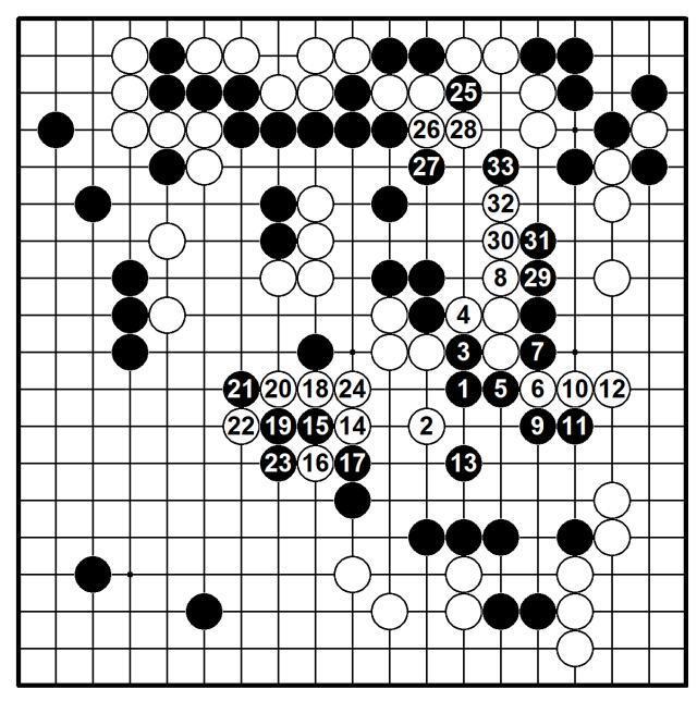 从黑25打开始,黑棋开始妙手连击。以下至黑33鼻顶一气呵成,白棋痛不欲生,黑棋则愉快通连,形势逆转。